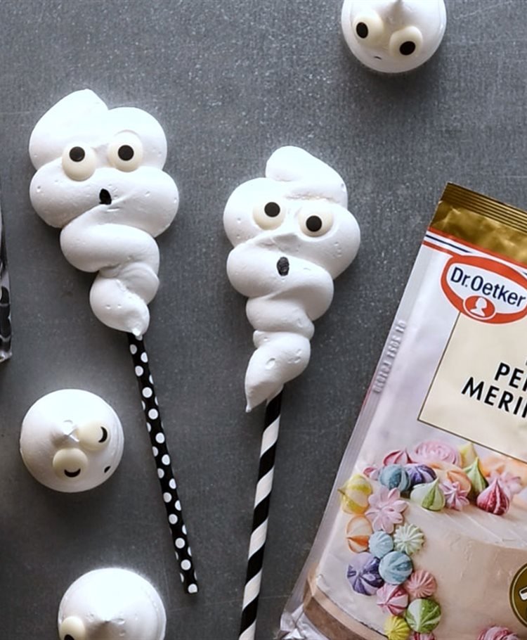 Suihkuta kummituksia kahdella tavalla. Pursota pieni määrä marenkia leivinpaperin päälle ja kiinnitä tikku marengin päälle. Pursota kummitukset tikun päälle siksak-kuvion muotoon. Pursota jäljelle jäävästä marengista pieniä marenkihuikkuja (halkaisija noin 3-4 cm). Koristele kummitukset sokerisilmillä. Paista marenkikummituksia uunin keskitasolla noin 90 minuuttia.