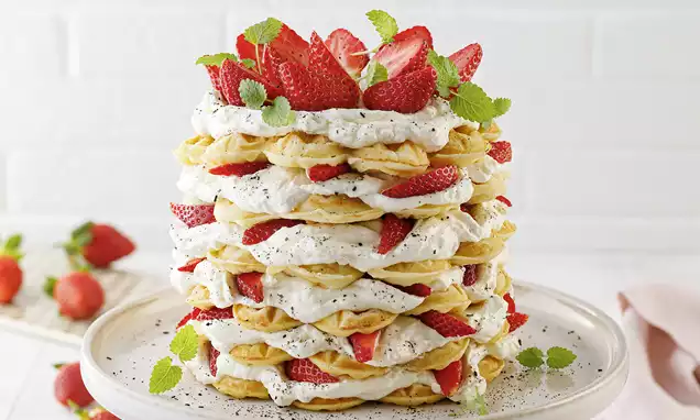 Täytä kakku vaniljatäytteellä ja mustikoilla. Kostuta kakkukerrokset maidolla samalla kun kokoat kakkua.