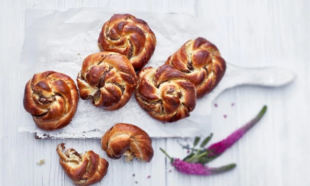 Aseta kaksi rullaa vuoan keskelle ja laita muut rullat niiden ympärille. Painele rullia hieman kasaan niin, että rullien välissä on hieman tilaa. Kohota kakkua 30 minuuttia kostutetun pyyhkeen alla lämpimässä paikassa. Paista uunin keskitasolla 45-50 minuuttia kunnes se on saanut väriä ja on kypsä tikulla kokeiltaessa. Anna kakun jäähtyä hieman ennen kuin poistat sen vuoasta. Jäähdytä kakku kokonaan.